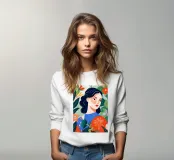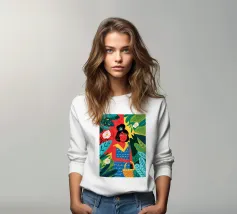 Questo disegno artistico mostra il ritratto stilizzato di una donna, incorniciato da un rigoglioso paesaggio floreale in colori vivaci come il blu, il verde, il rosso e l'arancione. Le linee chiare e la palette di colori armoniosa rendono questo motivo un punto di forza per gli accessori moderni per la casa. Perfetto per murales, cover per cellulari, cuscini o magliette, questo disegno conferisce eleganza e creatività a qualsiasi casa.
