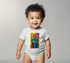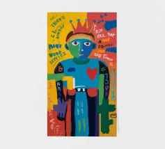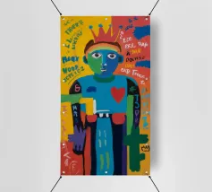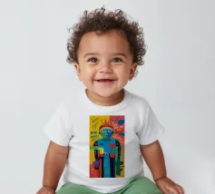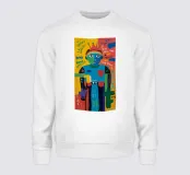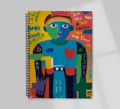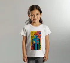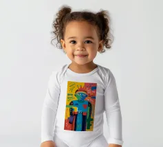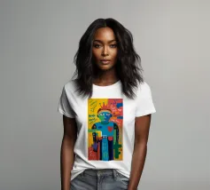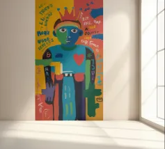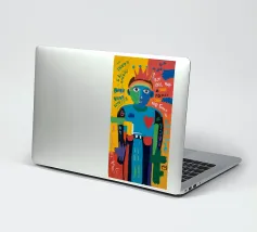 Una figura robotica ornata da una corona d'oro e dal simbolo del cuore sul petto si staglia su uno sfondo vivace e pieno di testo. I dettagli espressivi sottolineano sia gli elementi meccanici che quelli umani.