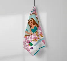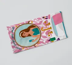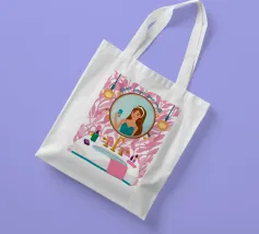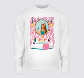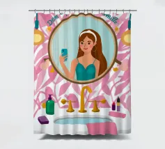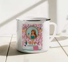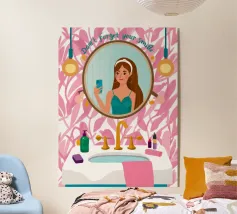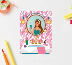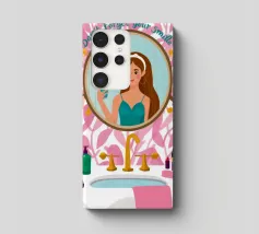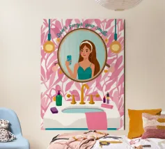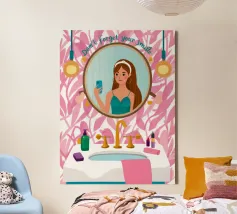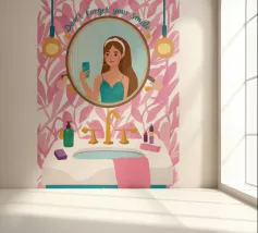 Illustrazione di una donna che guarda il suo riflesso in uno specchio ornato, circondata da vari prodotti di bellezza su un bancone del bagno. La scena è un'istantanea chic, intima ed elegante di una routine di bellezza quotidiana.