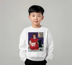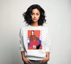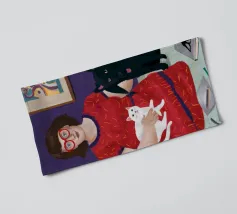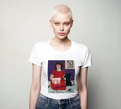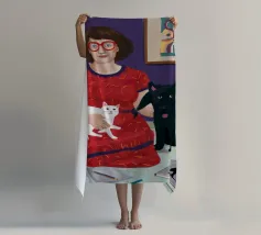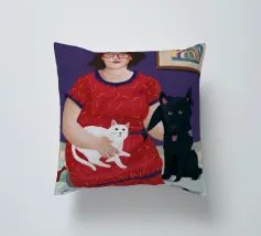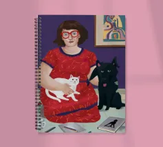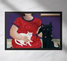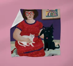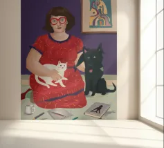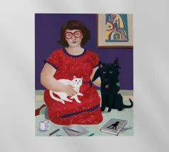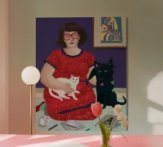 Una donna con occhiali e top rosso abbraccia un gatto nero, seduta su una sedia a motivi rossi su uno sfondo scuro, con vicino materiale artistico e un'opera incorniciata, a suggerire un momento creativo e intimo.