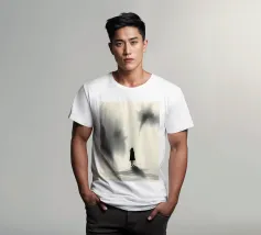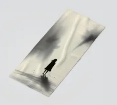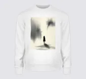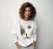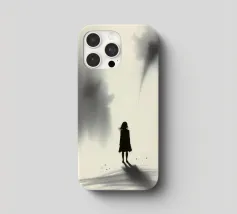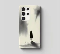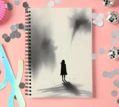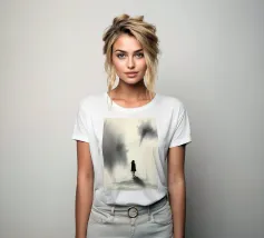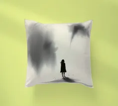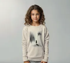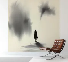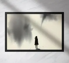 Una ragazza solitaria si trova su una superficie strutturata, circondata da ombre scure e vorticose. L'atmosfera è enigmatica ed evoca pensieri di meraviglia e introspezione.