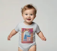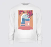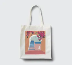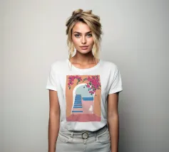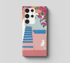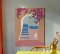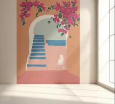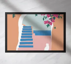 Un gatto bianco sonnecchia pacificamente in un classico arco mediterraneo ornato di bouganville rosa, affacciato su un mare blu. Questo pezzo cattura perfettamente il fascino sereno e solare di un'isola greca.
