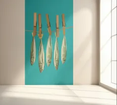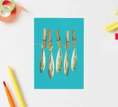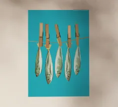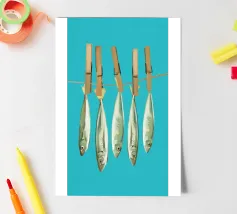 Aggiungete un tocco costiero giocoso al vostro spazio con questa stravagante opera d'arte digitale che raffigura sardine appese a mollette su uno sfondo turchese brillante. Questo pezzo, che unisce surrealismo e fascino marino, unisce umorismo, colore e tradizione marittima in uno stile fresco e moderno. Perfetto per cucine, case al mare o per gli amanti della cultura mediterranea e dell'arredamento nautico con un tocco di divertimento.