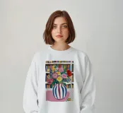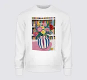 Un vivace bouquet di fiori in un vaso a righe, posto di fronte a una libreria colorata e affollata. La composizione è una miscela gioiosa e intellettuale di vita letteraria e bellezza naturale.