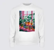 Una bella illustrazione di uno scaffale pieno di piante d'appartamento verdi e rigogliose, immerso nella calda luce del sole. La scena è un tributo sereno e gioioso alla bellezza di un giardino interno.