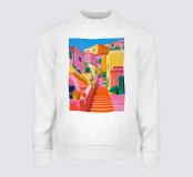 Una vivace scena di strada con edifici colorati e una scalinata rosa acceso che sale verso l'alto, evocando una vivace città costiera mediterranea o italiana.