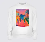 Una vista mozzafiato su una vibrante scalinata mediterranea, fiancheggiata da edifici colorati e palme rigogliose. La prospettiva attira lo sguardo verso l'alto, verso un cielo luminoso, creando un senso di ottimismo, avventura e il sogno di una perfetta fuga estiva.