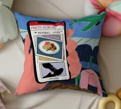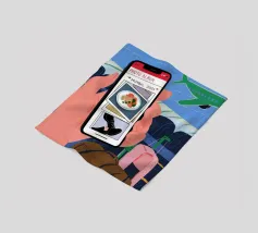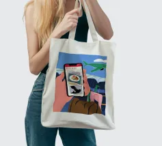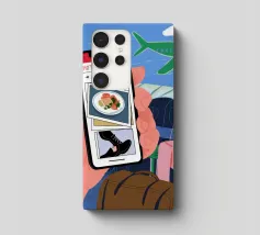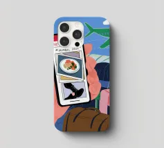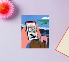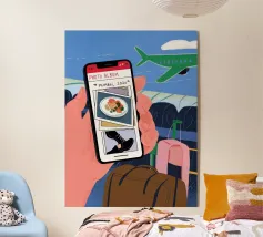 Un'illustrazione che mostra una mano che tiene in mano uno smartphone, scegliendo tra le destinazioni di volo online. L'immagine cattura l'eccitazione moderna e la possibilità di pianificare un viaggio in un mondo digitale.
