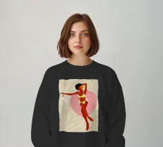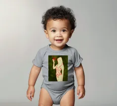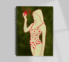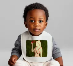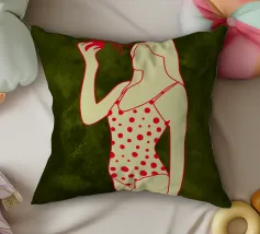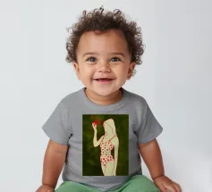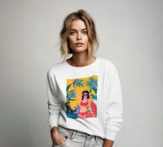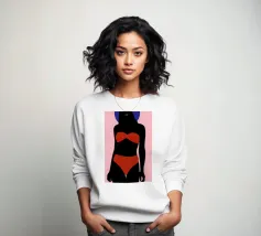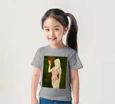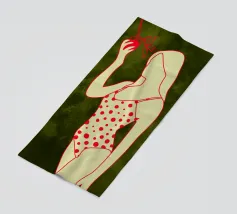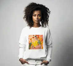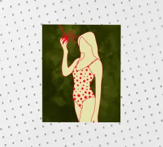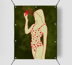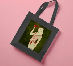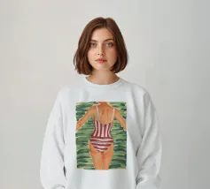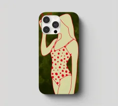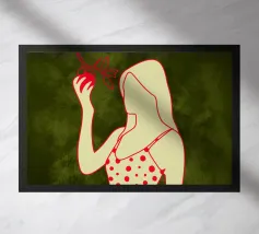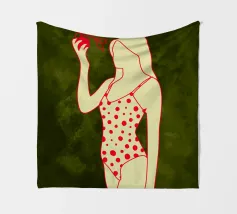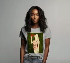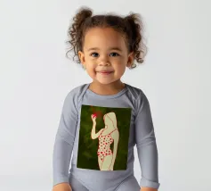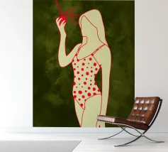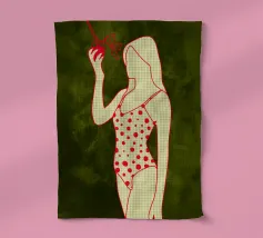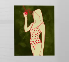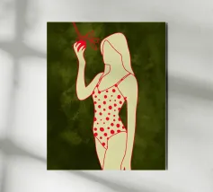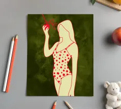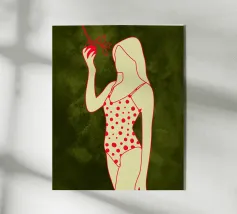 Una ragazza in costume da bagno a pois se ne sta tranquilla, allungando la mano per raccogliere un'arancia matura. La scena cattura un momento calmo e soleggiato che sembra allo stesso tempo nostalgico e fresco. Con contorni decisi e texture morbide, questo pezzo porta un tocco di semplicità estiva in ogni spazio.