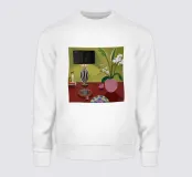 Una natura morta contemporanea mostra un vaso a righe con orchidee bianche posto su un tavolo rosso davanti a un televisore o a un monitor a schermo piatto nero, con altri oggetti vicini, su una parete verde.