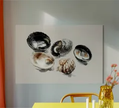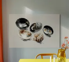 Una tranquilla composizione di cinque conchiglie danneggiate dalle intemperie, dipinte in caldi colori neutri e nero carbone, poggia su un morbido sfondo beige. Ogni conchiglia racconta una storia sottile: il tempo, la marea e la consistenza, offrendo un momento di quiete e semplicità tratto direttamente dalla riva del mare.