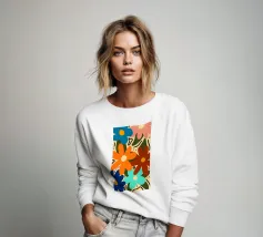 Una forma centrale arancione simile a un fiore esplode in mezzo a un turbinio di forme astratte ed elementi botanici. La composizione è dinamica ed espressiva, con steli blu, accenti rossi e uno sfondo beige strutturato, che cattura un momento di energia creativa.