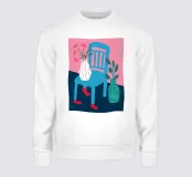 Un'affascinante ed eccentrica natura morta con una pianta in vaso appoggiata su una sedia blu brillante. La composizione è semplice ma piena di carattere, con colori vivaci e uno stile giocoso.