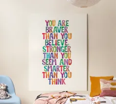 Illuminate qualsiasi spazio con la nostra stampa d'arte "Sei più coraggioso di quanto credi, più forte di quanto sembri e più intelligente di quanto pensi". Questo design vivace presenta scritte dipinte a mano con acquerelli arcobaleno su uno sfondo bianco pulito, creando una dichiarazione visiva gioiosa e stimolante. Perfetta per le camerette dei bambini, gli asili nido, le aule e le scuole materne, questa versatile opera d'arte aggiunge un tocco di colore e positività a qualsiasi parete. La giocosa tipografia realizzata a mano cattura l'immaginazione dei bambini e ne rafforza la fiducia. Lasciate che questo pezzo accattivante trasformi l'ambiente del vostro bambino.