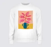 Un'illustrazione semplice ma d'effetto di una pianta dalle foglie rosa in un audace vaso blu su uno sfondo caldo, che celebra la bellezza del colore e della forma botanica minimalista.