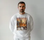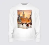 Questo dipinto d'atmosfera mostra una vivace piazza cittadina in inverno, con il caldo bagliore del tramonto e le luci scintillanti. Le persone scivolano felici sul ghiaccio, i bambini tengono per mano i genitori, mentre sullo sfondo brilla un magnifico edificio storico con una torre dell'orologio. I fiocchi di neve danzano nell'aria e l'atmosfera festosa diffonde gioia e accoglienza. Un omaggio alla magia dell'inverno e alla bellezza dei momenti condivisi.