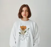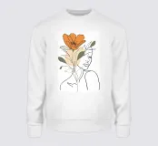 Un disegno al tratto minimalista raffigura un volto sereno intrecciato con un grande fiore arancione e foglie verdi. L'uso di linee semplici e di tonalità della terra crea una composizione elegante e rilassante.