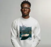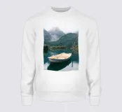 Una barca solitaria riposa pacificamente su un lago di montagna cristallino, circondato da cime imponenti e avvolte dalla nebbia e da una vegetazione lussureggiante. L'acqua a specchio riflette la bellezza senza tempo del paesaggio, creando una scena che sembra non essere stata intaccata dal tempo. Perfetto per portare calma e ispirazione in qualsiasi ambiente.