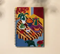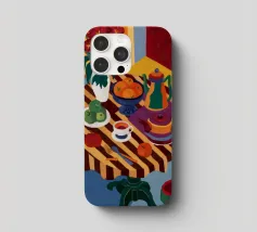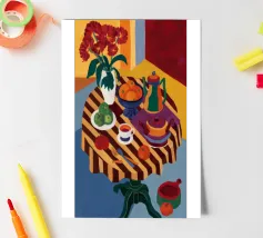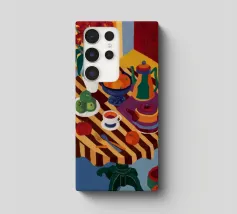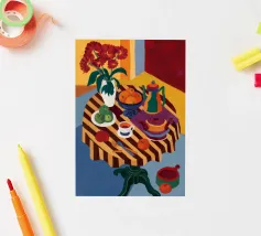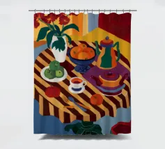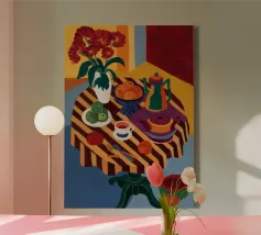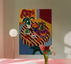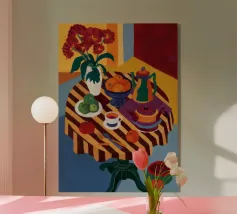 Una natura morta caotica e lunatica con un vaso, una brocca e della frutta su un drammatico motivo a strisce di tigre. La composizione è scura ed eclettica e crea un senso di energia selvaggia e indomita in un ambiente domestico.