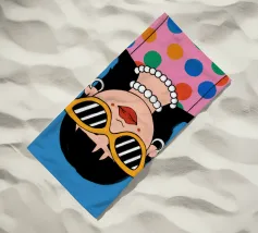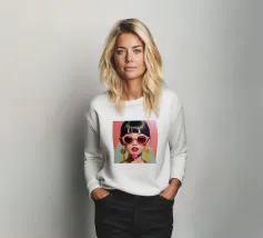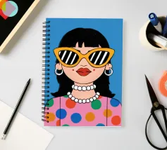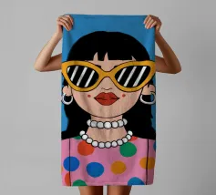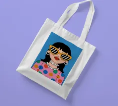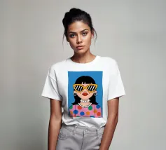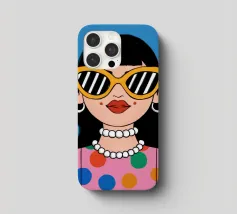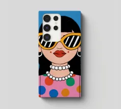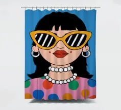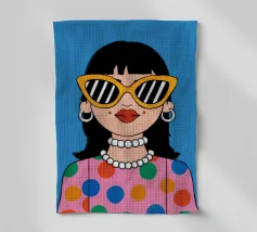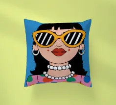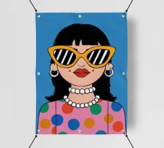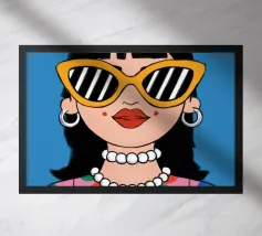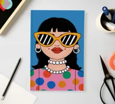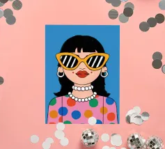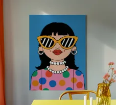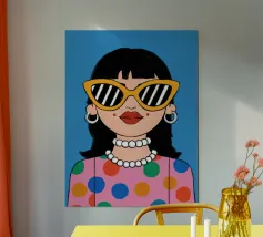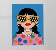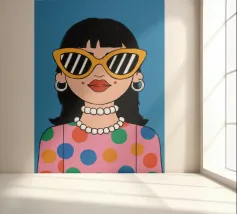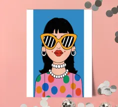 Ritratto chic di una donna con grandi occhiali da sole con montatura gialla, orecchini di perle e top a pois, che emana un'atmosfera cool e di ispirazione rétro su uno sfondo blu brillante.