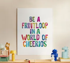 Aggiungete un tocco di bizzarria al vostro spazio con questa affascinante stampa tipografica. La giocosa frase "Be a Fruitloop In a World of Cheerios" prende vita in una vivace scritta acquerellata arcobaleno dipinta a mano, su un nitido sfondo bianco. Questo pezzo accattivante è un delizioso promemoria per abbracciare la propria unicità e distinguersi dalla massa. Perfetta per ravvivare qualsiasi ambiente, dalla cameretta dei bambini all'ufficio di casa, questa coloratissima opera d'arte susciterà sicuramente gioia e conversazione. Lasciate che questa stampa allegra vi ispiri a celebrare la vostra individualità ogni giorno.