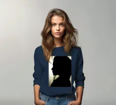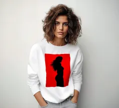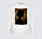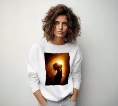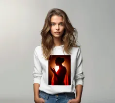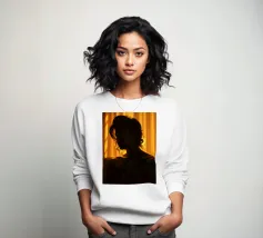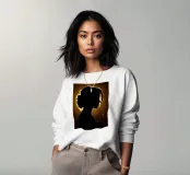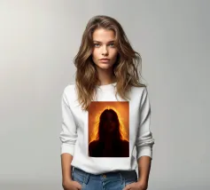Una donna è in posa di profilo, i suoi capelli brillano sottilmente su uno sfondo caldo. La luce soffusa evidenzia i contorni della sua silhouette, creando un'atmosfera calma e sognante.