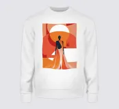 Illustrazione astratta minimalista ed elegante di una silhouette di donna in nero, in piedi davanti a un grande sole arancione, con un abito rosso fluente.