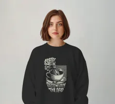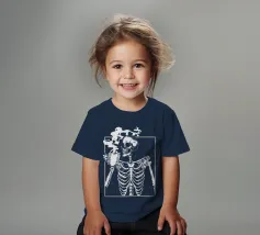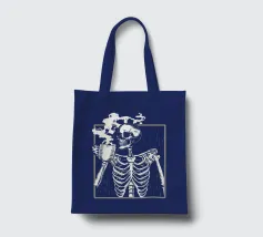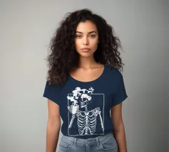 Uno scheletro è umoristicamente raffigurato mentre gusta una bevanda calda, con il vapore che fuoriesce dalla tazza. Il design monocromatico spicca su uno sfondo scuro, offrendo un mix di estro e macabro.