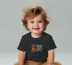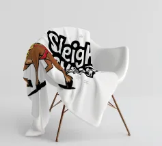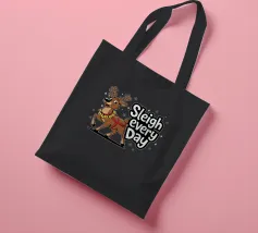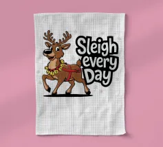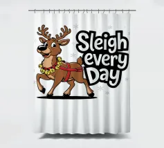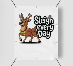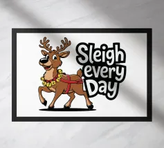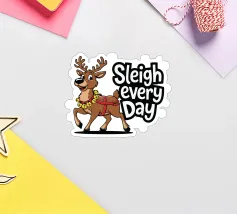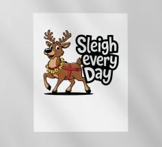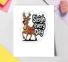 Un'allegra renna dei cartoni animati che indossa una pettorina si trova accanto alla frase "Sleigh Every Day", circondata da fiocchi di neve.