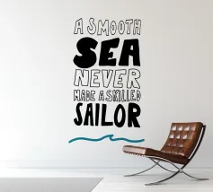 Poster di mentalità moderna con slogan incoraggiante: "Un mare liscio non ha mai reso un marinaio abile". Murale disegnato a mano con scritte nere e onde blu - ideale come poster per il soggiorno, l'ufficio o la camera da letto. Perfetto come regalo per marinai, surfisti, amanti del mare o come decorazione per chiunque cerchi motivazione, coraggio e vibrazioni marine. Stampa artistica di alta qualità, moderna, minimalista e piena di significato. Poster con frasi, citazioni, frasi motivazionali, frasi di mentalità come decorazione murale marittima e arte tipografica per tutti coloro che amano il mare.