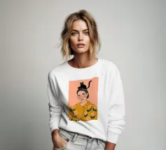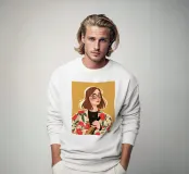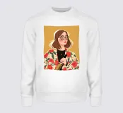 Questa opera d'arte raffigura una persona con capelli corti e biondi che indossa una giacca floreale e tiene in mano un libro. Lo sfondo giallo brillante ne esalta l'essenza chic ed elegante.
