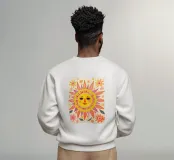 "Sole allegro in colori vivaci: un design radioso per le stanze e l'abbigliamento dei bambini". Questo vivace motivo presenta un sole sorridente con gli occhi chiusi, circondato da raggi colorati e fiori giocosi. Le intense tonalità di giallo, rosa e arancione creano un'atmosfera dinamica e allegra che piacerà ai bambini. Perfetto come poster, decorazione murale o su top per dare a qualsiasi stanza o abbigliamento un'atmosfera positiva e solare. Questo design combina elementi giocosi con un'estetica moderna, ideale per i piccoli fan del sole.