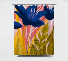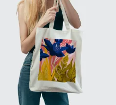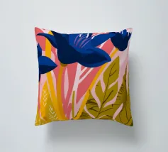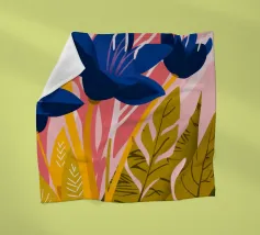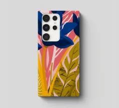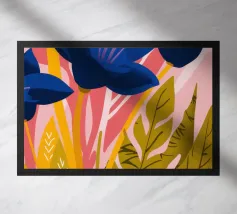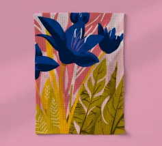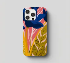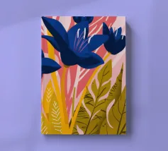 Un'opera d'arte botanica astratta presenta foglie blu cobalto su uno sfondo giallo oro, suggerendo un fogliame sotto un sole brillante in uno stile potente e ad alto contrasto.