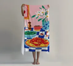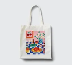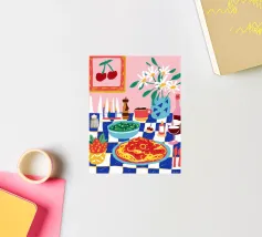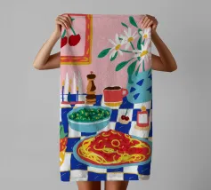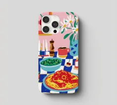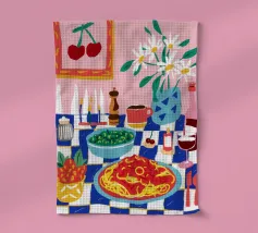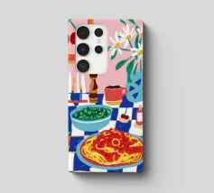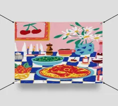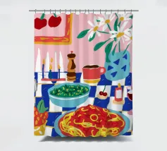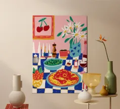 Un'affascinante natura morta di un piatto di spaghetti con ciliegie, accanto a un vaso di gigli bianchi. La composizione è un abbinamento unico, bello e un po' stravagante di un piatto classico e di fiori eleganti.