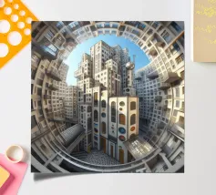 Una straordinaria scena architettonica caratterizzata da edifici cilindrici futuristici con intricati motivi geometrici, visti da una prospettiva a tunnel verso il cielo. Il progetto combina strutture innovative ed elementi visivi audaci per un concetto urbano accattivante.