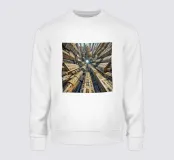 Una surreale visione fisheye di strutture urbane torreggianti con dettagli intricati e modelli simmetrici, che convergono verso un cielo radioso. Il design architettonico stratificato evidenzia l'innovazione moderna e la creatività artistica.