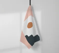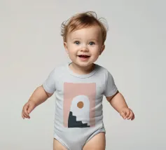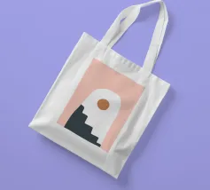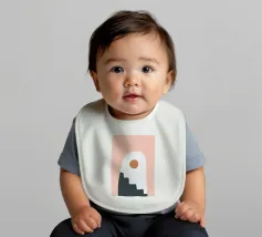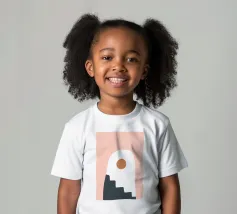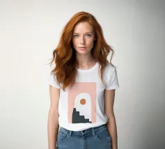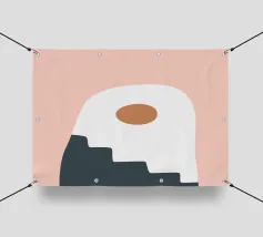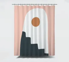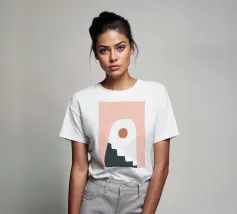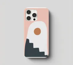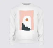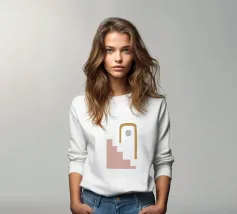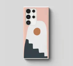 Una composizione astratta con forme geometriche, tra cui un motivo a scala nera che sale attraverso un arco bianco su uno sfondo rosa tenue. Un cerchio marrone pieno è posizionato vicino alla cima, aggiungendo un punto focale al design minimalista.