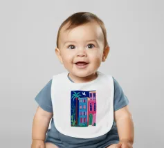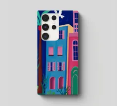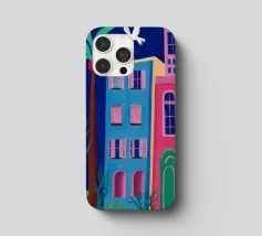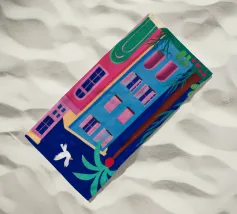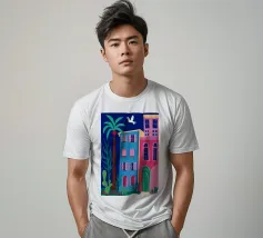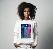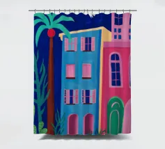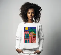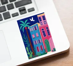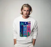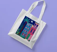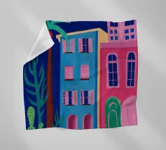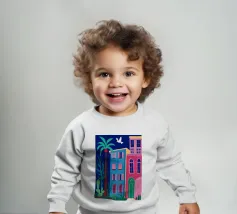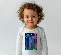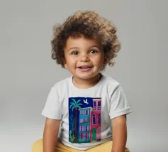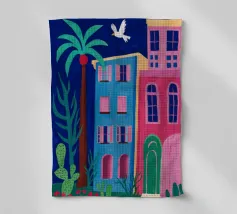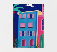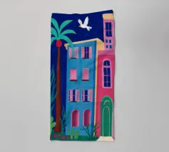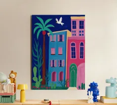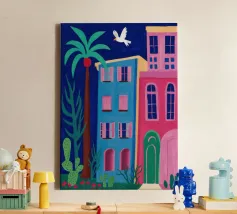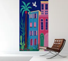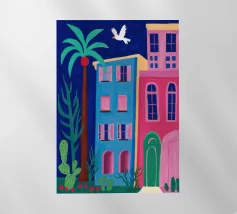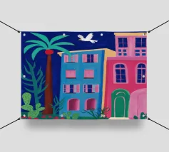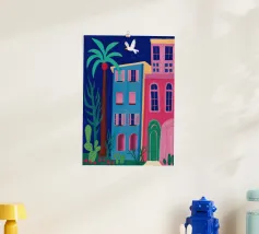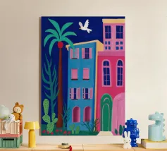 Illustrazione di una strada vivace e colorata che si snoda in una città collinare, con case luminose e un'unica palma. La scena è una rappresentazione gioiosa, energica e pittoresca di una comunità vivace.