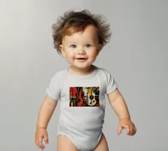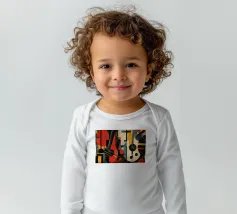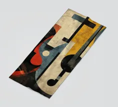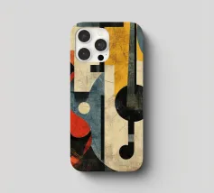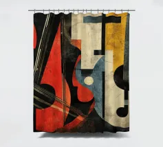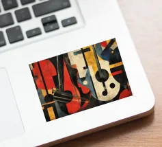 Un moderno dipinto astratto con forme geometriche che formano chitarre, violini e note musicali in una composizione audace e colorata. Lo sfondo strutturato e la disposizione dinamica evocano un senso di ritmo e di espressione artistica.
