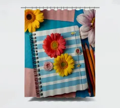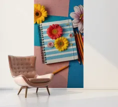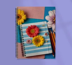 Un taccuino a righe con fiori vivaci si trova su uno sfondo blu e rosa, accompagnato da matite colorate e da una matita arancione, per creare un'area di lavoro allegra.