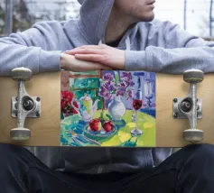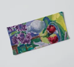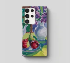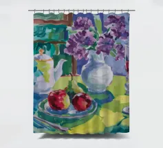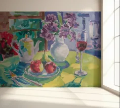 Composizione di natura morta con una teiera d'argento, una tazza da tè, una ciotola di frutta (mele, uva) e un bicchiere di vino rosso su una tovaglia bianca. Lo sfondo è di un fresco blu-verde. Lo stile enfatizza la forma e il riflesso.
