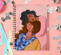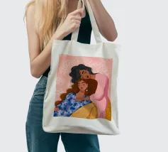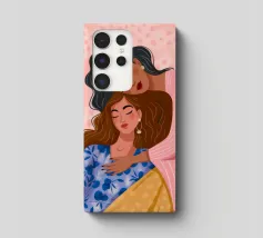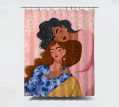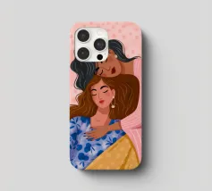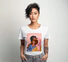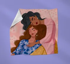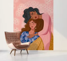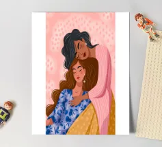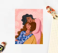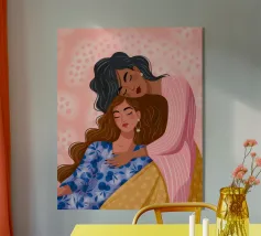Questa opera d'arte raffigura due persone in un tenero abbraccio, con una persona che appoggia la testa sulla spalla dell'altra. I colori caldi e lo sfondo morbido trasmettono un senso di amore e comfort.