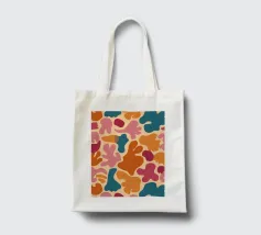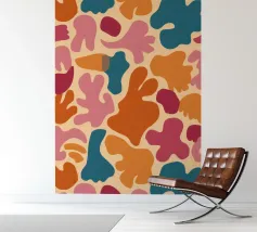 Un motivo astratto moderno ed elegante, caratterizzato da forme fluide e organiche in una calda tavolozza di terracotta, arancio, rosa e blu. La composizione è equilibrata e ha un'atmosfera sofisticata e giocosa.