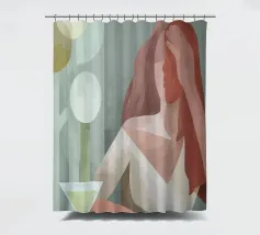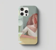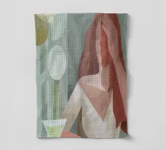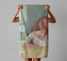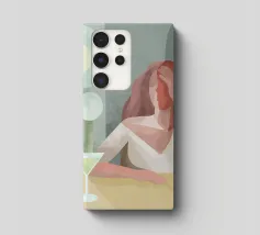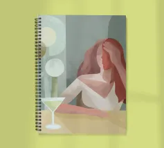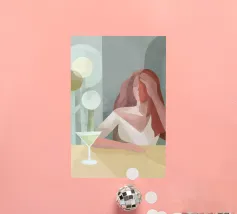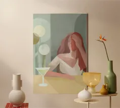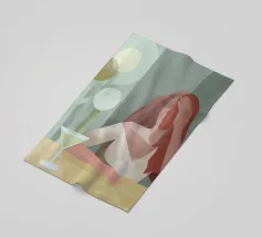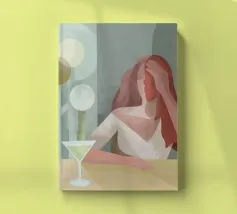 Illustrazione con forme stilistiche e colori freddi, che simboleggia la stanchezza di una madre che si riposa con un drink la sera.