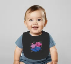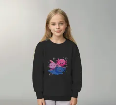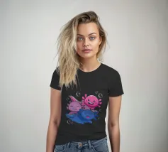 Tre axolotl dei cartoni animati nei toni del blu, del rosa e del viola sembrano nuotare gioiosamente insieme, circondati da bolle. Trasmettono un'atmosfera giocosa e simpatica.