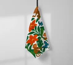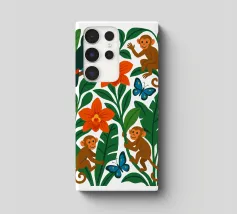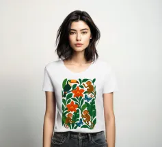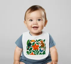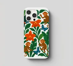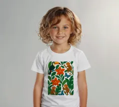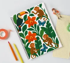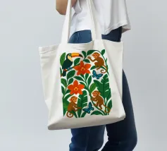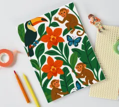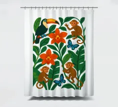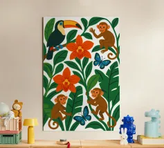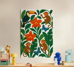 Tre scimmie e un tucano in un giardino con fiori per bambini e per la casa