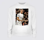 Un ritratto che cattura un momento appassionato di Toni Kroos, giocatore chiave del Real Madrid, che festeggia una vittoria sul campo. Vestito con l'iconica maglia bianca dei Los Blancos, la sua espressione facciale vivace e i pugni stretti dimostrano l'alta passione e la dedizione alla squadra. Questa foto riflette la gioia e l'emozione cruda di un atleta.