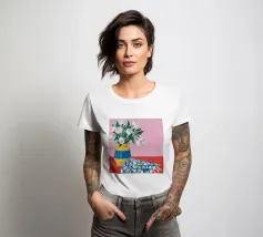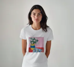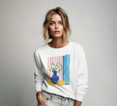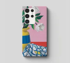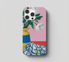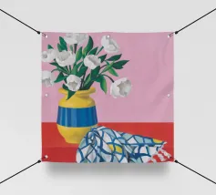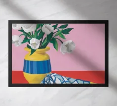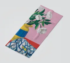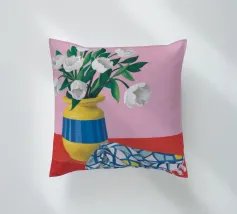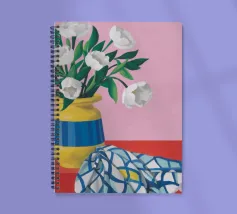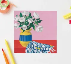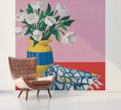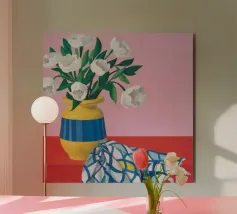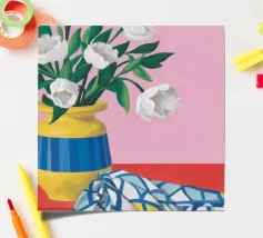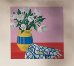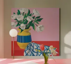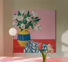 Una semplice ed elegante natura morta di tulipani bianchi in un vaso a righe gialle e blu. La composizione è adagiata su un panno a fantasia su uno sfondo rosa tenue, che evoca una sensazione di calma e serenità.