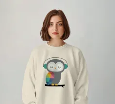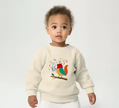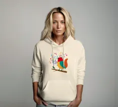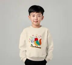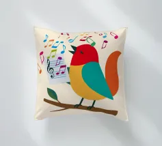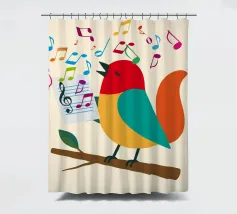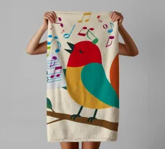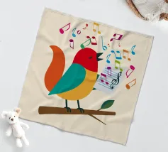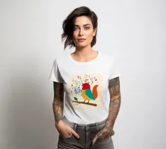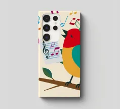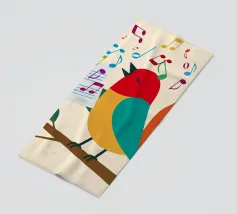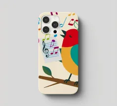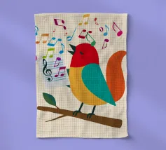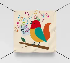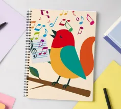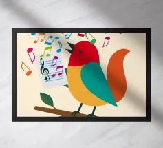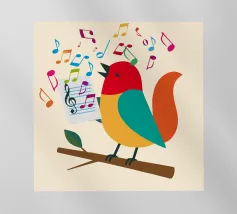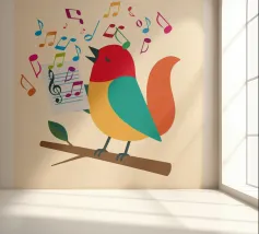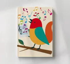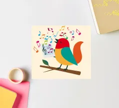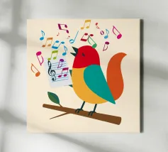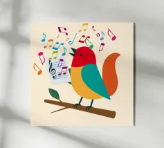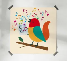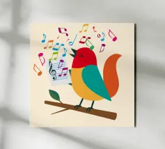 Un uccello vivace e colorato che tiene in mano e canta uno spartito con brio e allegria - ideale per temi musicali e illustrazioni creative.Uccello colorato in stile allegro Spartito vivace in colori vivaci Composizione espressiva e fantasiosa Perfetto per temi musicali o progetti allegri Simboleggia creatività, leggerezza e gioia