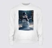 Un pupazzo di neve, con tanto di cappello a cilindro e sciarpa, saluta la sera d'inverno in una foresta serena. I fiocchi di neve cadono delicatamente intorno, creando un'atmosfera magica.